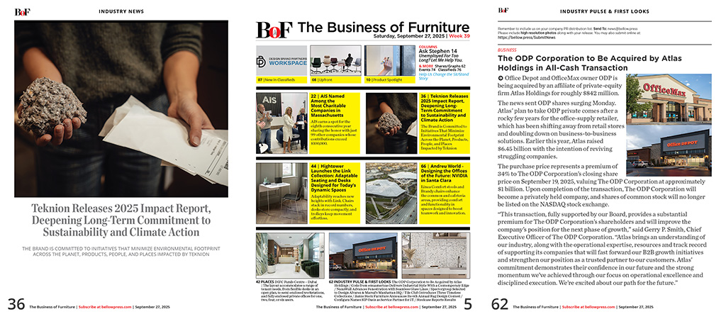 The ODP Corporation to Be Acquired by Atlas Holdings in All-Cash Transaction / Code from emuamericas Delivers Industrial Style With a Contemporary Edge / NanaWall Advances Fenestration with Seamless Glass Lines Through Pioneering Uniform System / Spectorgroup Selected to Design Alvarez & Marsal's Manhattan HQ / Tile Club Introduces Three Timeless Collections—Alata, Boldara, and New Terrazzo / Jamie Stern Furniture Announces Its 6th Annual Rug Design Contest / Configura Names SIP Oasis as Service Partner for IT for the Southeast, One of Two Nationwide / Steelcase Reports Second Quarter Fiscal 2026 Results