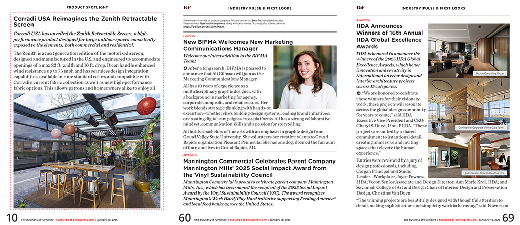 Artcobell Welcomes Goldston and Shmurduq to Marketing Team / Allseating Appoints Lisa Hogan as Regional Sales Director / NEWH, Inc. Announces Deidre Schwartz as 2026 President / Austin American-Statesman Names Formaspace a Winner of the Greater Austin Top Workplaces 2025 Award / Move Solutions' Megan Monette McDaniel Named Top Salesperson by the Office Moving Alliance / Crane Reps to Represent Indiana Furniture in the Southwest Region / Ankrom Moisan Opens Austin, Texas Office to Serve Region's Growing Development Market / NEWH Awards $80K in Scholarships During BDNY 2025 / Renson Promotes Priscilla Olivas to Director of Marketing Amid Unifying Strategy for Renson and Corradi USA Brands / NanaWall NW MultiSlide 630 Earns Three Major Industry Awards for Product Innovation / ISG Brings Full-Service Design Expertise to Ohio / Francesco Favaretto Appointed Global Creative Director at Sunon