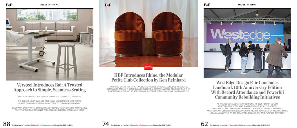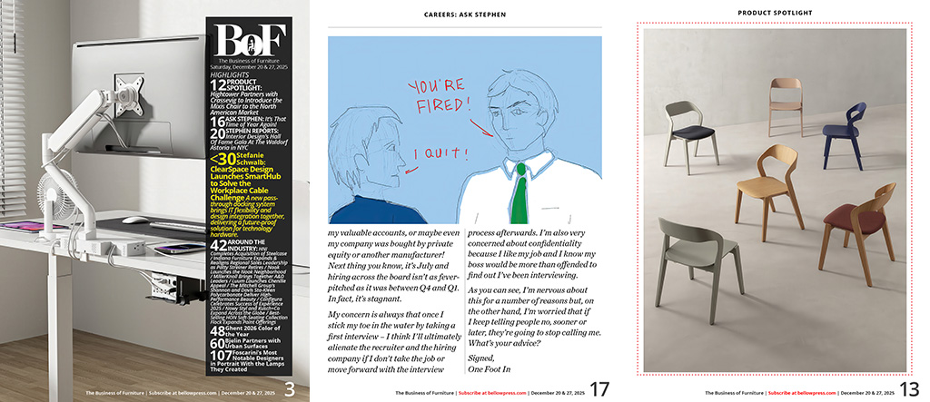 New publications about predicting change, not just watching it / Deb Bailey: Take nothing for granted / Sales' love-hate relationship with technology / Finding Talent Requires Strategy / Stephen Says / Ten "S" (teps) Toward the "OotF" / Losing Control of Your Brand / Stop Poaching my Employees! / Develop Your Most Important Asset: Your People / Ergonomics Faces Future With More Handhelds, Fewer Desks / Sales vs Marketing? The Internet has Changed that Relationship Forever / JRB Studio completes the design circle / In2Design's experience benefits growing customer base / West Elm Workspace takes industry by storm / The future of coworking / National learns from its own new HQ experience / DWR's dynamic duo:Edelman & McPhee / FluidStance is on the Level (and hopes you are too) / Tech startup PointDrive picks furniture close to home / Folkert Goes Big, Goes Bold / Industry Can Learn From The Coworking Movement / AV can add to a Dealer's Bottom Line / Where's Your ShowroomR? Everywhere / Group Dekko: Supplier to Budding Tech Company / Emory University connects with Backbone / HDR Chicago / IDEO has joined the creative kyu collective, a unit of Tokyo-based Hakuhodo DY Holdings / Studio Wise Uses Expertise in Specials to Create New Lines / Reflections on Groupe Lacasse turning 60 from its CEO / MOI Moves to New D.C. NoMa Showroom / idesk, Cherryman make a Splash on Silicon Beach in L.A. / Stir unveils new Product / The Backlash Against Collaboration / Melissa Price Helps Detroit Pop / Artopex showrooms / PWV Takes Carpets to New (Corporate) Levels / Dauphin Retools for the North American Market / History is Important but OM is Ready for the Next 30 Years /