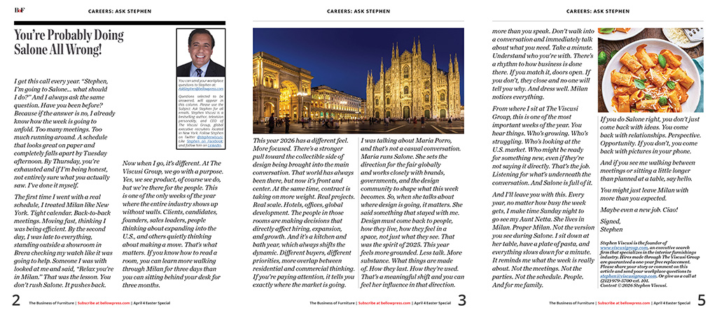 •   ASK STEPHEN - "You're Probably Doing Salone All Wrong!" - Stephen Viscusi - From where I sit at The Viscusi Group, this is one of the most important weeks of the year. You hear things. Who's growing. Who's struggling. Who's looking at the U.S. market. Who might be ready for something new, even if they're not saying it directly. That's the job. Listening for what's underneath the conversation. And Salone is full of it.